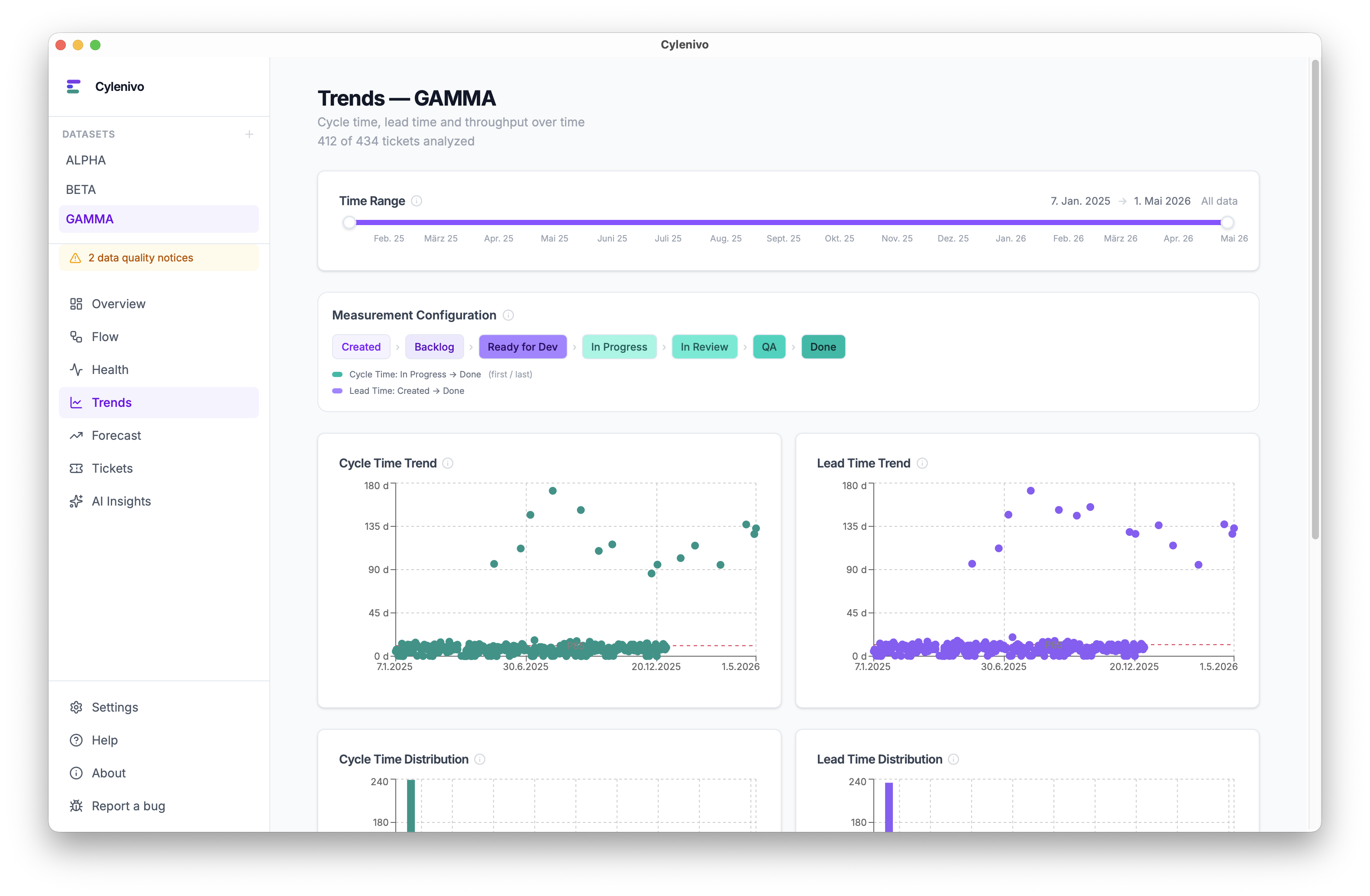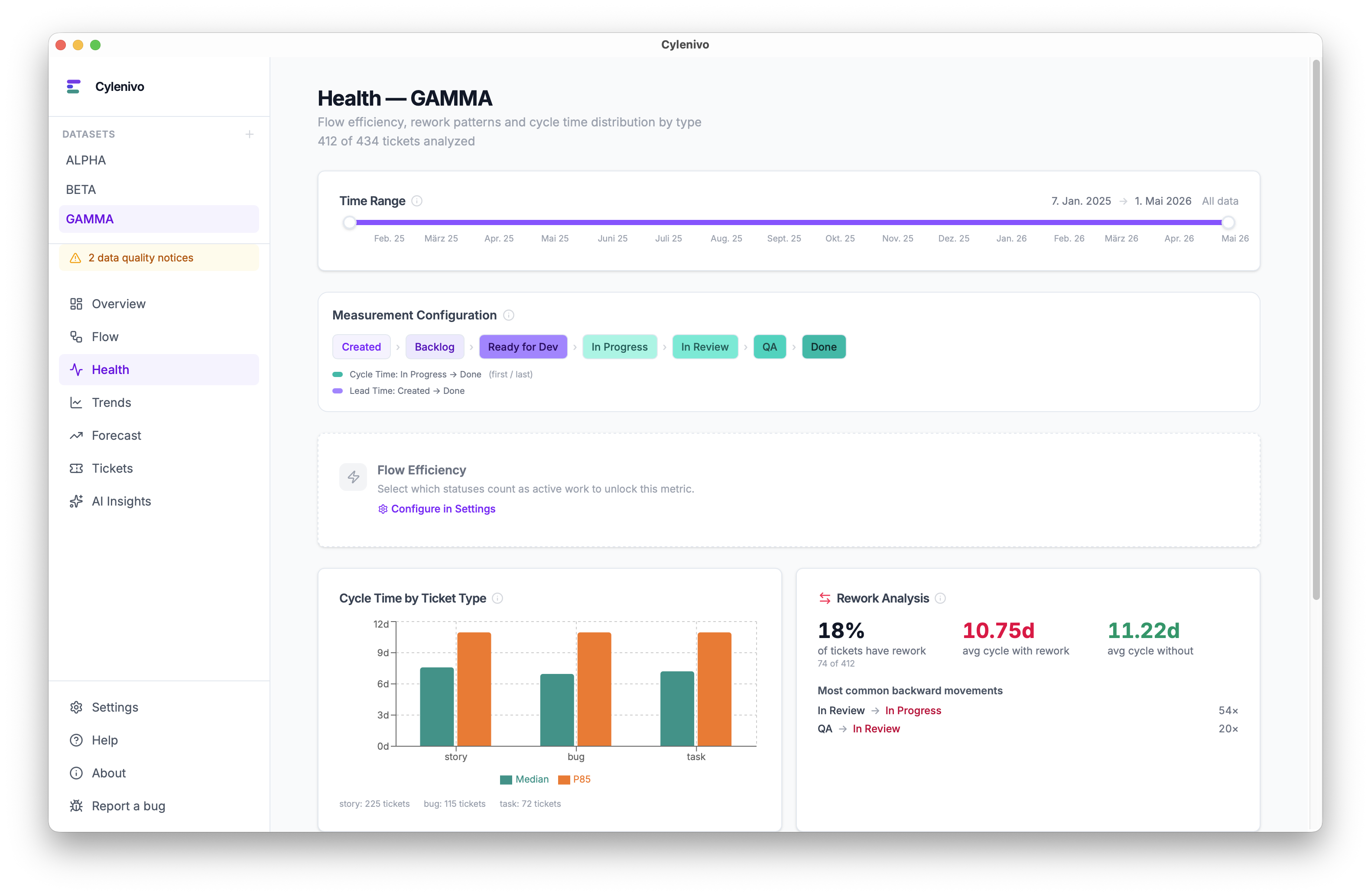 Cylenivo is a small, free desktop app (Windows, Mac and Linux) that computes Cycle Time, Lead Time, Throughput, Time in Status and Rework from your ticket data. It pulls the data from Jira, or via plugins from Trello or OpenProject, and processes it locally.